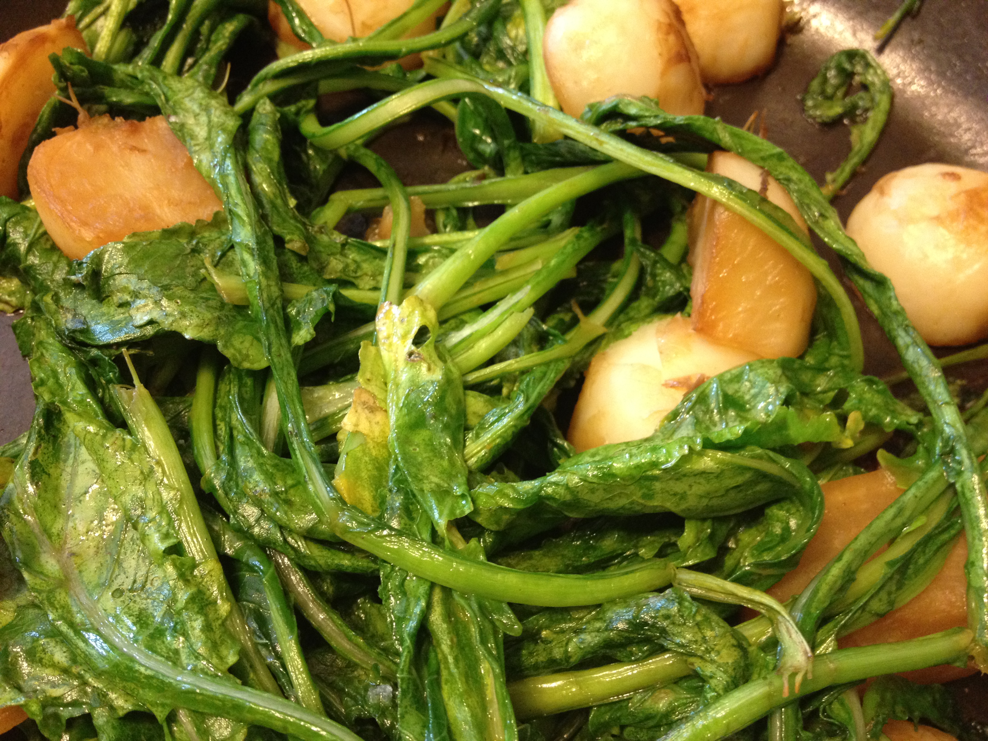 Glazed Hakurei Turnips with their own greens. Glazed in butter and water, with a dab of molasses and a pinch of sea salt.