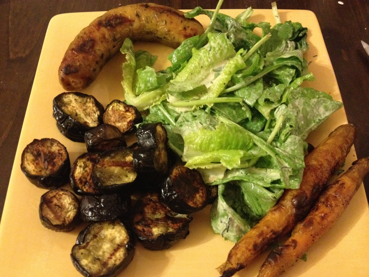 Last night we grilled up some eggplant and carrots and threw together a quick green salad with fresh arugula and lettuce (all from our CSA share from Sol Flower Farm! I can’t recommend this enough!). Adding in a few sausages (Seafood Sausage from Union Market, for me), it was a very complete summer meal. But how to pull it all together? Dress it up, baby…